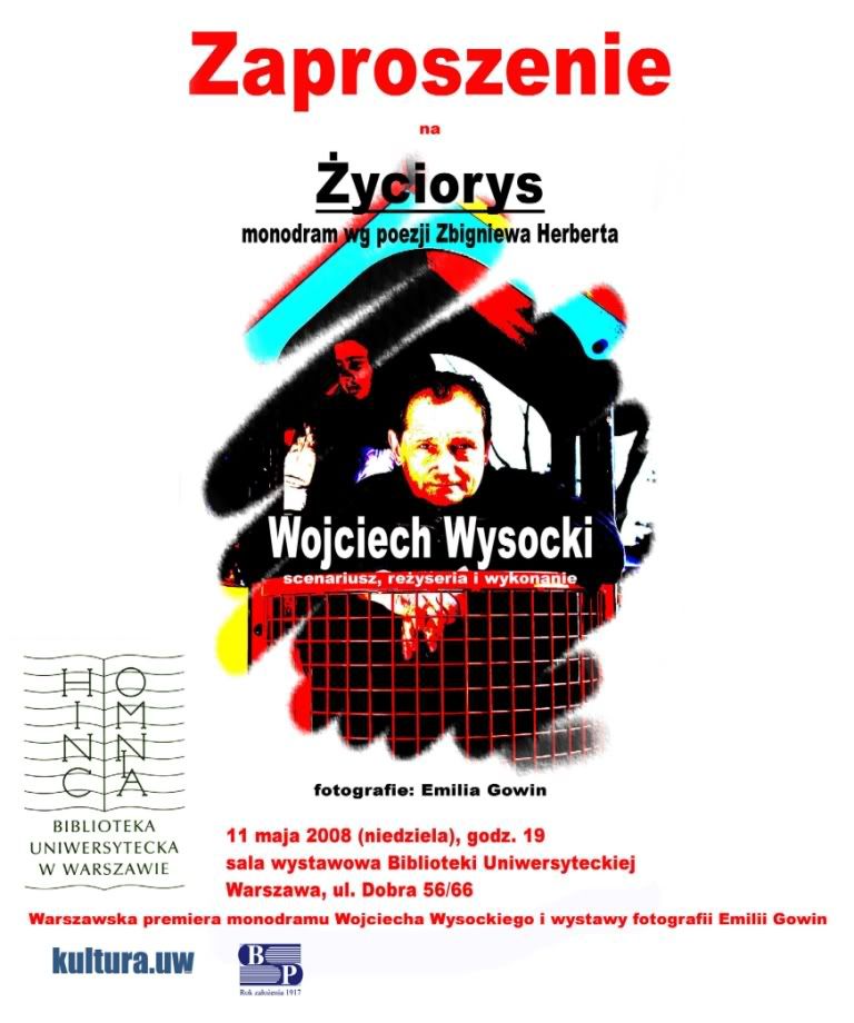Biblioteka Uniwersytecka w Warszawie i portal kultura.uw zapraszają na monodram Wojciecha Wysockiego Życiorys według poezji Zbigniewa Herberta oraz wystawę wielkoformatowych zdjęć Emilii Gowin stanowiących artystyczne przedsięwzięcie popularyzujące twórczość Księcia Poetów.